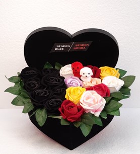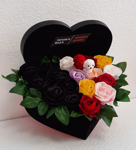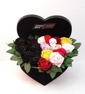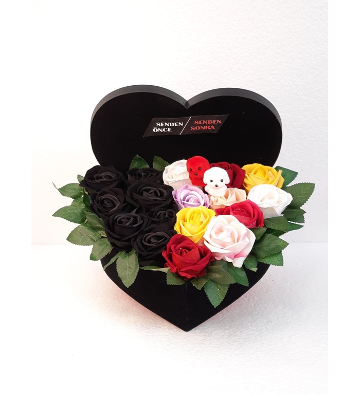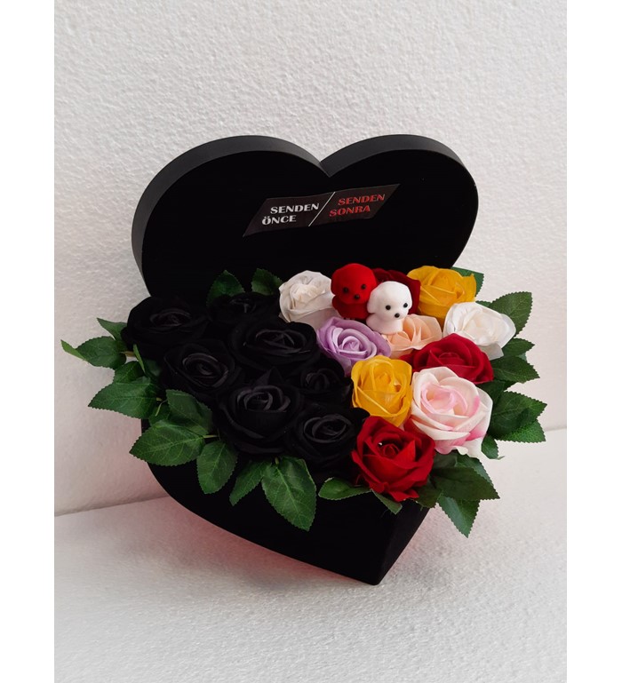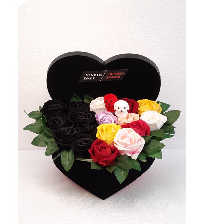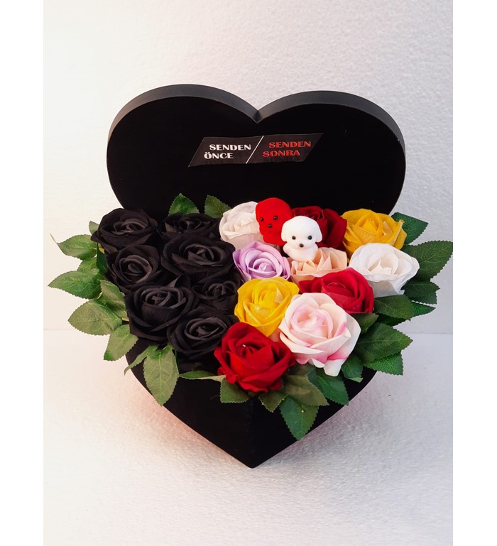 senden önce senden sonra kutu gül aranjmanı gülşler yapay çiçeklidir
